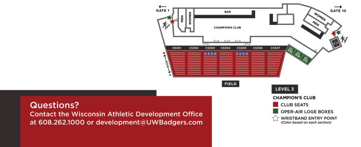 As a Club Seat holder, you'll enter at Level 3, with access to the Ho-Chunk Gaming Champions Club. Entry points for Level 3 include a stairwell on the east side of the end zone and a stairwell/elevator on the west side of the end zone near Gate 10. (Please refer to the map below.)