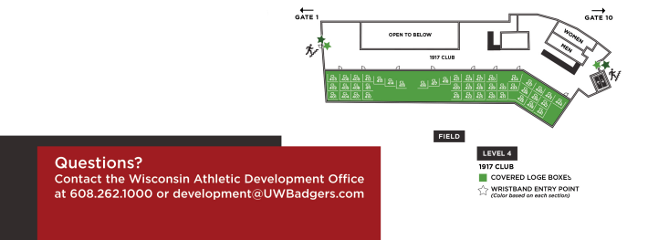 As a Covered Loge Box seat holder, you'll enter at Level 4, with access to the Ho-Chunk Gaming 1917 Club. Entry points for Level 4 include a stairwell on the east side of the end zone near the ramp to Gate 1 and a stairwell/elevator on the west side of the end zone near Gate 10. (Please refer to the map.)